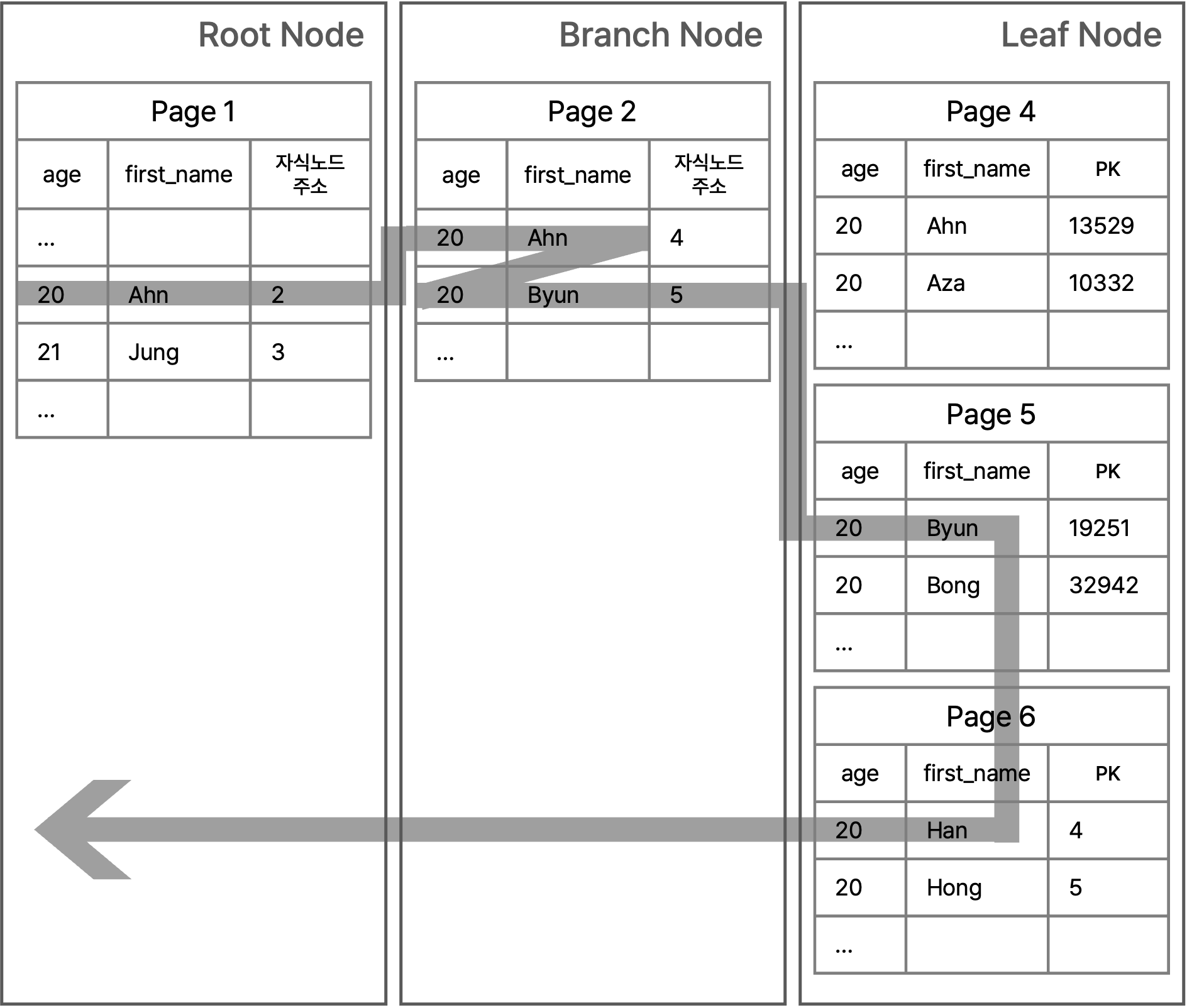 WHERE 절에 있는 조건으로 인덱스를 탐색하며 범위를 만족하는 값을 찾는 과정을 회색 화살표로 표시했다.