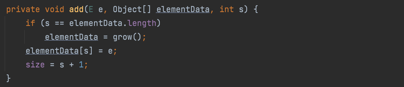 우리는 add(E e)를 호출하지만, 내부적으로 add(E e, Object[] elementData, int s)가 호출된다.