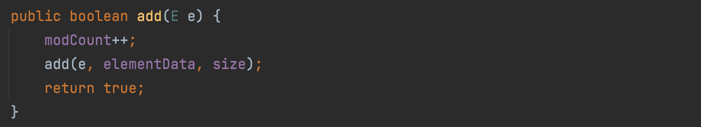 add(E e) 메서드는 modCount를 하나 증가시키고, 오버로딩된 다른 add 메서드를 호출한다.