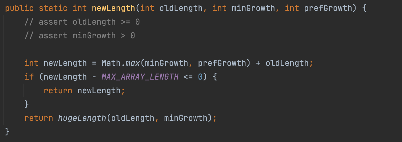 - 그렇지 않은 경우(새 길이가 배열최대길이보다 크면) hugeLength(oldLength, minGrowth) 메서드를 반환한다.