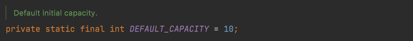 - 용량을 지정하지 않았으므로 기본값인 10이 capacity가 된다.