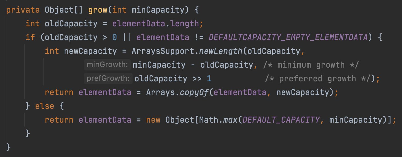 - ArraysSupport.newLength(oldCapacity, minCapacity-oldCapacity, oldCapacity >> 1)의 값을