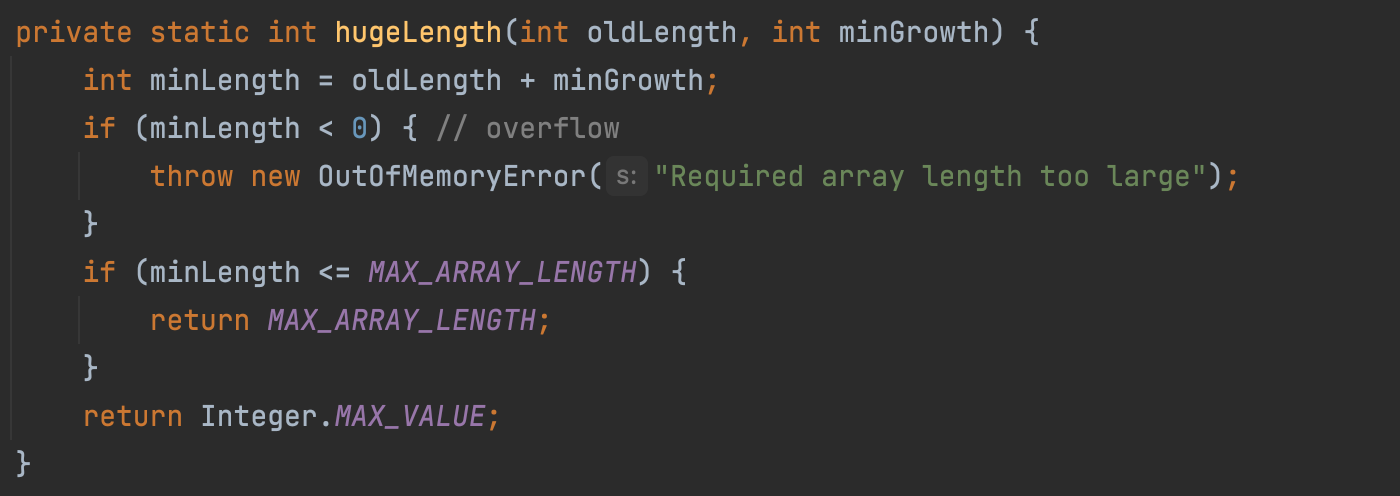 이 메서드는 배열의 새 길이가 MAX_ARRAY_LENGTH 보다 큰 경우 새 길이를 정해주는 메서드다.